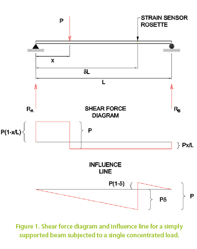 Consider initially a simplified model of a bridge scenario, where an individual axle load is applied at a distance from the left support of a simply supported beam of length. The theoretical influence line (excluding dynamic effects) for the internal shear force, measured by a sensor that is located at a distance from the left support, is shown in Figure 1.