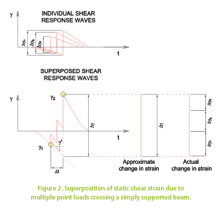 where Δγ = γ(t+) - γ(t-) is the change in the shear strain time history when a load passes over a location on a beam. Equation [8] shows that it is possible to build a proportional relationship between the shear strains and the loads that travel over the bridge. However, for the calculation of the gross vehicle weight it is necessary to use the superposition principle. For this, consider the theoretical response wave(which is the time-domain counterpart of the influence line) for the shear force generated by a series of loads, as shown in Figure 2.