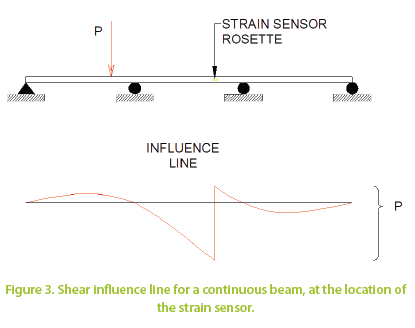 At this point, it is essential to acknowledge that influence lines for indeterminate bridges are not linear functions of the distance, in contrast to Equation [1]. However, the concept developed here can be extended to continuous, multi-span (indeterminate) bridges as it is based on the discontinuities marked by the sharp peaks and ,which are not affected by the shape of the influence line. To exemplify this, consider the influence line shown in Figure 3 for a multi-span continuous beam. This example shows the shear influence line at the location of the sensor, caused by the transit of a load Pover the continuous beam. It can be seen that even though the influence line is not a linear function, the difference between the extreme values at the discontinuity remains to be equal to the magnitude of the moving load. The complex shape and properties of the influence line are not required for the BWIM method proposed here.