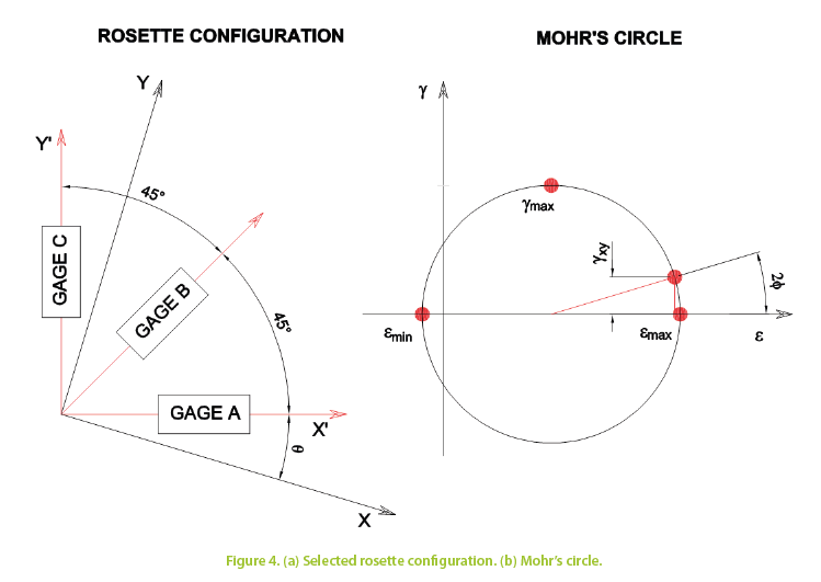 This sensor arrangement provides the principal strains for any orientation of the rosette, which can be obtained from the expressions