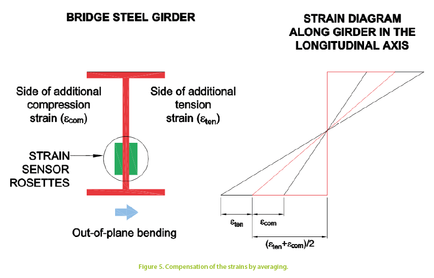 Now, depending on the applied loading, overall geometry of the bridge, slendernessof the girders cross-sections and the support conditions, girders webs (or other bridge components being instrumented) might experience out-of-plane bending effects. If this kind of bending is present, it will cause additional compression in one face of the girder and tension in the other, affecting the measured strains. Therefore, if the strain is measured only on one side of the girder, its magnitude will be increased or decreased accordingly. In order to account for this phenomenon, measures can be taken from opposite sides of the web and the strains averaged, as shown in the example of Figure 5. When the additional horizontal compression strain caused by out-of-plane bending, εcom is averaged with the tension one on the opposite side of the web, εten , the net strain that would be measured without any out-of-plane effect is obtained. In this way, the spurious effects of any out-of-plane bending occurring on the bridge are minimized for BWIM purposes.