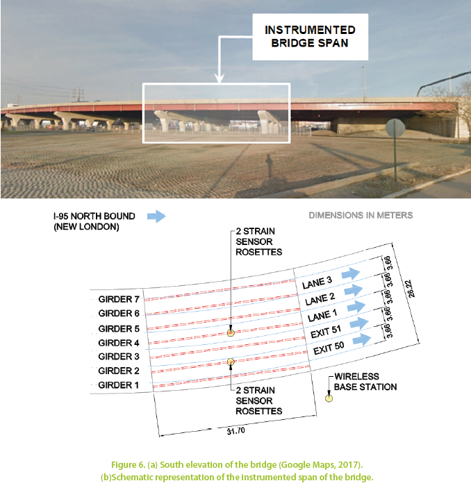 A field test was performed on a multispan continuous bridge that carries Interstate 95 (I-95) Northbound over Stiles Street, New Haven, Connecticut, United States of America. This section of the bridge is a slightly curved five-lane bridge with a total length of 31.7 meters (104 ft) and a width of 26.2 meters (86 ft). It was constructed with seven steel girders and a reinforced concrete deck. A photo of the south facing elevation is shown in Figure 6a. The bridge dimensions of interest, travel lanes, girder distribution and location of the sensors used in this study, relative to the lanes of travel on