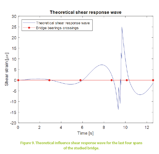 It should be noted that for the superimposed shear response, the strains corresponding to the moments at which the truck crosses over a support are not equal to zero. This happens because the influence response wave of each individual axle occurs at a slightly different time and therefore their superposition gives non-zero values at the bridge support crossing times. This response wave was constructed for comparison purposes with the shear strains determined from measured strains. However, as mentioned before, the shape of the influence response wave is not needed in this method for the calculation of the GVW.
