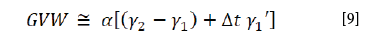 In Figure 2, γ1 and γ2 are the extreme peaks captured on the shear strain record, Δt is the time between these measurements, γ1´ is the slope of γ1, Δγ is the estimated change in strain and Δγα, Δγb and Δγc are the strain changes caused by the individual point loads, or axles for the case of a truck crossing over a bridge. As shown in Figure 2, it is possible to approximate the actual total strain change by the prolongation of the shear strain γ1 over a time Δt (resulting in Δtγ1´) added to the difference between the extreme peaks. In mathematical terms, the estimated GVW is estimated as