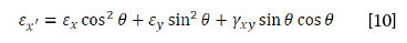 where θ is the angle of a system that is rotated counterclockwise with respect to the axis x. In this study, Gages A, B, and C are placed at angles θ of 0°, 45° and 90°, respectively. Then, substituting these angles on Equation [11], it is obtained