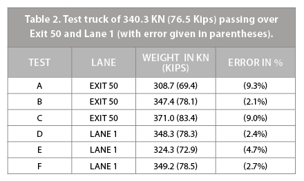 From Table 1, the average values are αE50= 16.19 KN (3.64 Kips) for Exit 50 and αL1=20.60 KN (4.63 Kips) for Lane 1. Using the averaged values for alpha and Equation [9], the calculated GVWs for the passages of the trucks are shown in Table 2.
