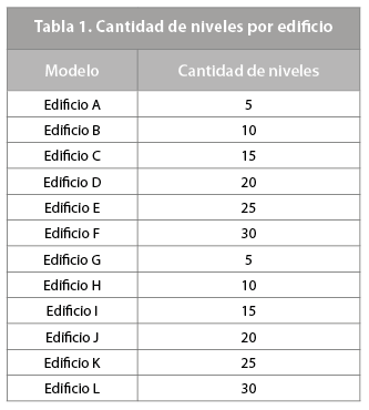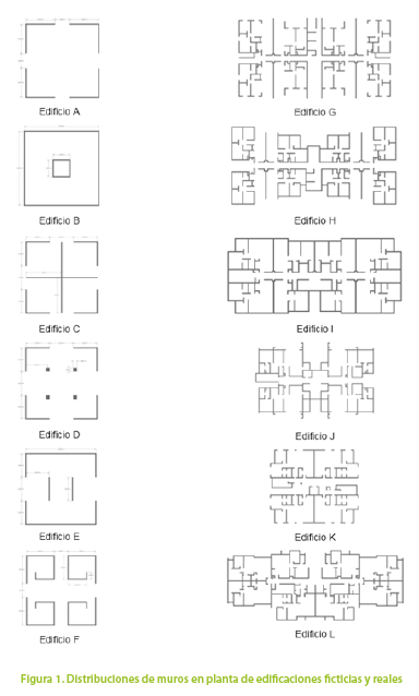 Para esta investigación se modelaron un total de doce edificaciones, de las cuales las seis primeras corresponden a edificios ficticios con distribuciones en planta simplesylas seis restantes a edificios reales con distribuciones de muros mucho más complejas. Se consideraron estructuras que van desde los 5 hasta los 30 niveles y con alturas de piso de 3 m. La cantidad de niveles utilizado para cada edificación se muestra en el Tabla 1, mientras que la Figura 1 muestra las distribuciones en planta de muros para cada estructura.