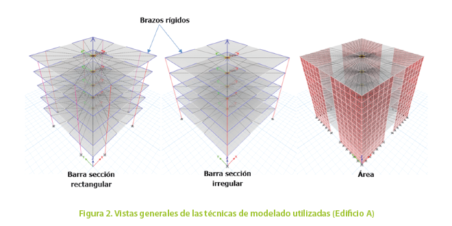 La Figura 2 muestra una vista de los modelos del Edificio A ejecutados a través de las diferentes técnicas. Como puede observarse para el caso del modelo ejecutado través de elementos tipo barra de sección trasversal rectangular se utilizan dos elementos para conformar la sección de muros en forma “L”, mientras que en el modelado a través de elementos tipo barra con sección transversal irregular se utiliza un único elemento cuya sección transversal sea en forma de “L”.