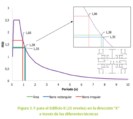 Los valores del Factor Espectral Dinámico (FED) utilizados para el cálculo del coeficiente sísmico de una estructura dependen directamente de los períodos principales asociados a esta. En general, este aspecto adquiere mayor relevancia a medida que se aumenta la cantidad de niveles de un edificio, ya que con la altura los períodos se desplazan hacia la derecha de la plataforma del espectro de diseño y en dicha zona conforme aumenta el período se reduce el valor del FED y viceversa, tal como se observa para el caso del Edificio K en la Figura 3, donde se aprecia la incidencia de la variación del período a través de la diferentes técnicas estudiadas en el FED utilizado para el cálculo de la fuerza sísmica.
