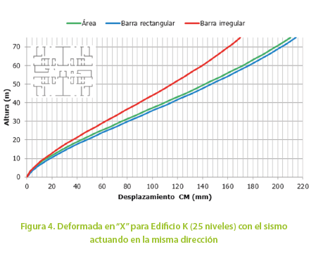 La Figura ٤ muestra el perfil de deformación del Edifico K en la dirección “X”, evidenciando que el modelado a través de elementos tipo barra con sección transversal irregular conforma modelos con mayor rigidez lateral.