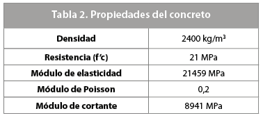 El único material utilizado en el modelado fue el concreto reforzado; cuyas propiedades se muestran en el Tabla 2.