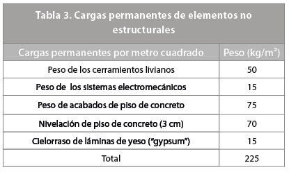 Las cargas del peso propio de las estructuras se calcularon automáticamente por el programa computacional ETABS (CSi, 2015); considerando espesores de 200 mm para muros y entrepisos. El resto de cargas asignadas corresponden a cargas típicas de edificaciones cuyo uso es de apartamentos. Las cargas permanentes de elementos no estructurales pueden observarse en el Tabla 3, mientras que la carga temporal se estableció con una magnitud de 200 kg/m2 (Tabla 6.1 del CSCR-2010). Dichas cargas se asignaron como cargas uniformemente distribuidas sobre los entrepisos.