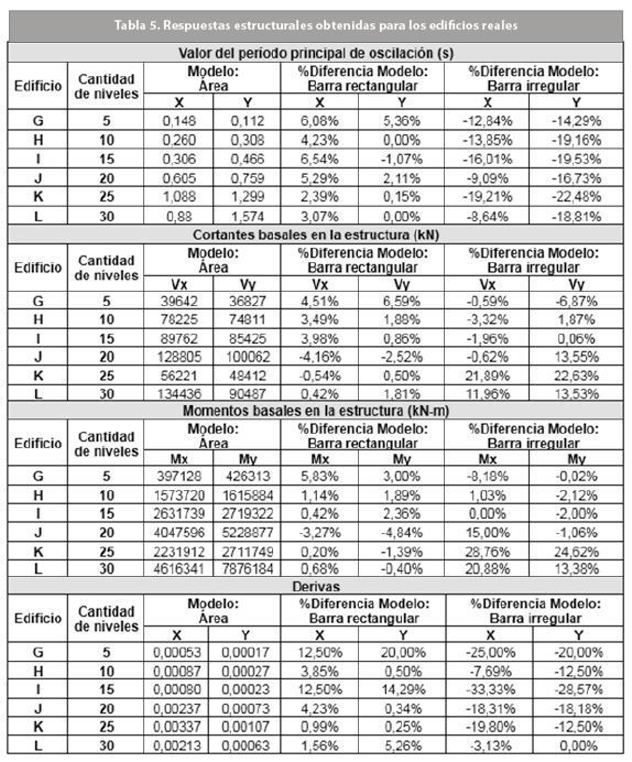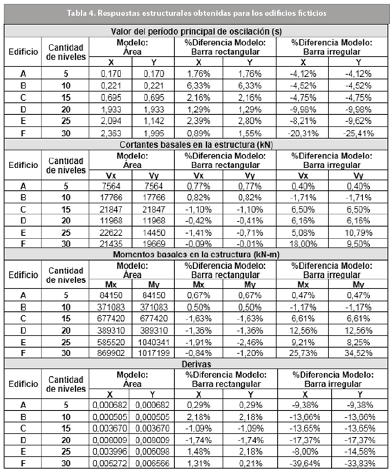 En las Tablas 4 y 5 se resumen las respuestas estructurales globales obtenidas (períodos, fuerzas de sismo en la base de la estructura y derivas) para los edificios ficticios y reales a través de las diferentes técnicas de modelado estudiadas. Es importante mencionar que para efectos comparativos se tomó como referencia los modelos de elementos de tipo área, calculando la diferencia porcentual entre modelos de la siguiente manera: