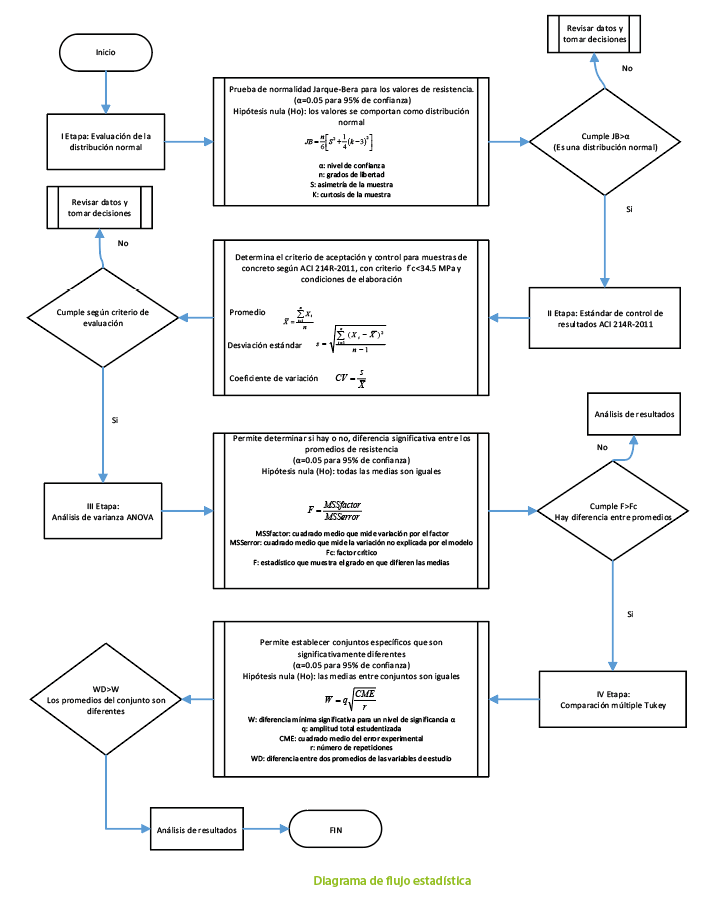 Para poder probar la hipótesis de que la resistencia del concreto es diferente al variar la procedencia del agregado y del cemento, se hace necesario el uso de herramientas de estadística inferencial. Las pruebas de análisis de varianza (ANOVA, por sus siglas en inglés) requieren que los datos empleados sigan una distribución normal. Si bien el informe ACI 214 permite la suposición de que los resultados de resistencia del concreto a los 28 días siguen una distribución normal, en este trabajo se probó esta condición a partir de las pruebas de normalidad de Shapiro-Wilk y Jarque-Bera.