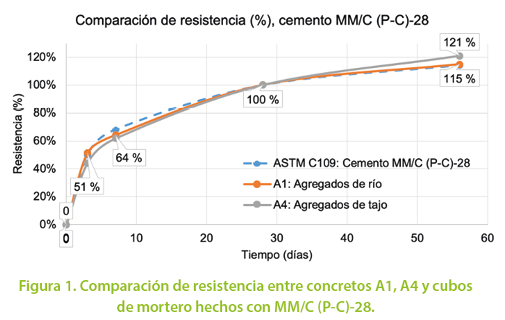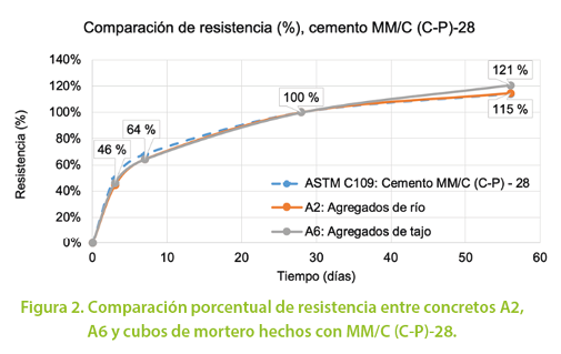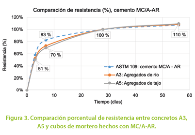 Por otra parte, cuando el porcentaje de resistencia obtenido se contrasta con el del concreto hecho en MC/A-AR, sí se observa una diferencia sustancial (de hasta 20 % en cubos de mortero) en la forma en que se obtiene la resistencia.