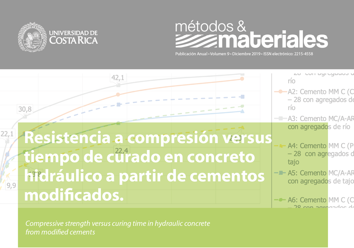 Este artículo presenta una síntesis de los resultados experimentales obtenidos al ensayar la evolución de la resistencia a la compresión en concretos hechos con distintos cementos modificados, a diferentes edades. Se incluye la caracterización de dos agregados de procedencias distintas (río y tajo) y tres tipos de cemento modificado. Los cementos ensayados corresponden al MM/C(P-C)-28, MM/C(C-P)-28 y MC/A-AR. El objetivo del estudio fue generar las curvas estándar de desarrollo de resistencia de seis mezclas de concreto usando estos cementos y agregados. Las pruebas de caracterización se llevaron a cabo siguiendo los estándares del Instituto de Normas Técnicas de Costa Rica (INTECO) y la Sociedad Americana de Pruebas y Materiales (ASTM). El curado de especímenes de concreto se realizó en cámara húmeda a 4 edades diferentes (3, 7, 28 y 56 días). La resistencia del concreto se obtuvo por medio de ensayos en la Máquina Universal, posteriormente, se procesó y validó estadísticamente los resultados, utilizando los parámetros de aceptación del informe del Instituto Americano del Concreto (ACI 214-2002). A partir del análisis realizado, se logró generar las curvas de desarrollo estándar de resistencia para todos los cementos en estudio, según dos procedencias de agregados e incluyendo un análisis estadístico inferencial para los resultados de resistencia de los concretos. Se concluyó que, al variar la procedencia del agregado para un mismo cemento, su resistencia es significativamente diferente (en términos estadísticos), al igual que para un mismo agregado, cuando se cambia el tipo de cemento.