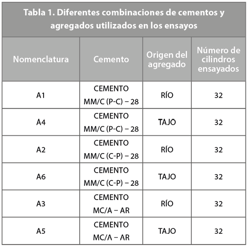 Los primeros dos cementos tienen una resistencia especificada a 28 días de 28 MPa; el tercero, a 1 día de 14 MPa y a 28 días de 38 MPa. Las combinaciones de agregado y cemento se detallan en la Tabla 1.