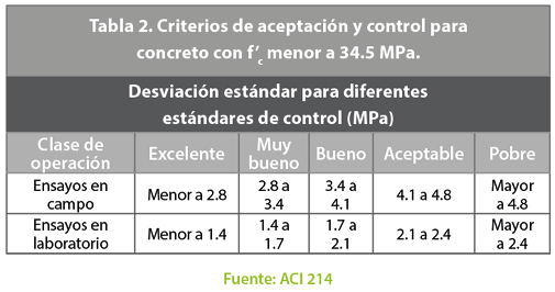 El análisis estadístico de los datos se basó en lo propuesto por el informe ACI 214 Evaluación de los resultados de resistencia del concreto. Este documento establece una metodología de control de resultados, donde se analiza la desviación estándar y el coeficiente de variación. En la Tabla 2, se muestran los valores de desviación estándar para diferentes niveles de control en concretos de f´c menor a 34.5 MPa. Para el caso de concretos con f´c mayor a 34.5 MPa, el comité del ACI 214 recomienda el uso del coeficiente de variación, pues, para mayores resistencias, este se ve menos afectado (ACI 214, 2009; Cook, 1989). En la Tabla 3, se muestran los valores de coeficiente de variación para resistencias mayores a los 34.5 MPa.