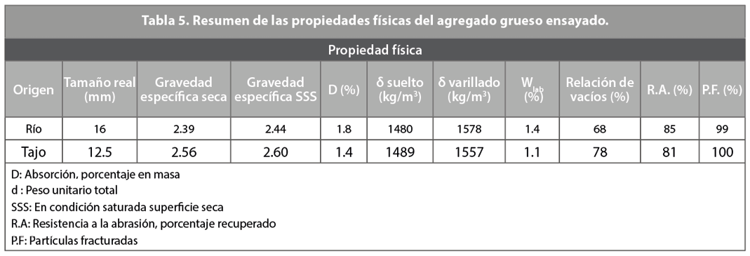 Para el ensayo de granulometría, se realizaron 8 réplicas con el fin de obtener la desviación estándar entre muestras, mientras que, para los demás ensayos de caracterización, se hicieron 3. En la Tabla 5, se muestran los resultados experimentales de la caracterización de los agregados gruesos, tanto de río como de tajo.