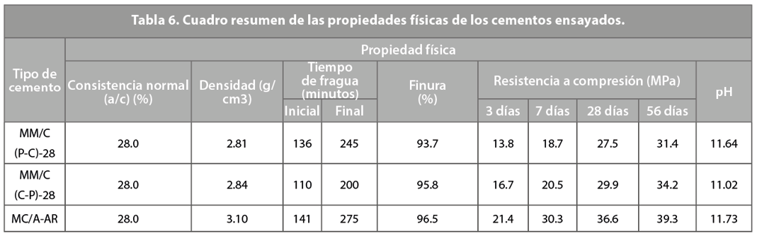 En la Tabla 6, se muestran los resultados experimentales de la caracterización de los cementos.