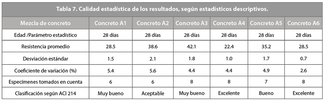 En la Tabla 7, se muestran los estadísticos descriptivos de la resistencia a la compresión a los 28 días de edad, para las 6 mezclas de concreto ensayadas. Como se mencionó, se usa la resistencia a los 28 días, pues los resultados del Informe ACI 214 son válidos únicamente para esta edad. En el caso de que la resistencia fuera mayor a 34.5 MPa, se usó el coeficiente de variación, en lugar de la desviación estándar. La clasificación de la calidad estadística de los resultados fue dada a partir del valor de la desviación estándar o del coeficiente de variación, según aplicara. Para garantizar una mayor precisión, en algunos casos se eliminaron datos: el mayor o el menor (según cuál afectaba más la desviación estándar).