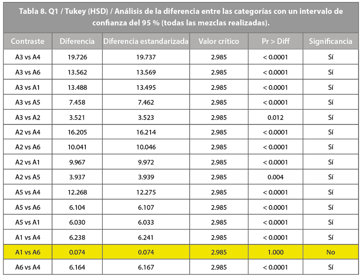 Cabe destacar que si bien se eliminaron algunos datos para obtener un promedio de resistencia más certero y, así, una calidad estadística mayor, esto fue únicamente para la generación de las curvas de resistencia. Esto no fue así para las pruebas de análisis de varianza Anova, que exigen muestras del mismo tamaño. La Tabla 8 ofrece los resultados de la prueba de Tukey (en la que se compararon las 6 mezclas de concreto) y permite responder la siguiente pregunta: ¿Existe una diferencia significativa entre las resistencias de cada una de estas mezclas de concreto, si se las compara una a una?