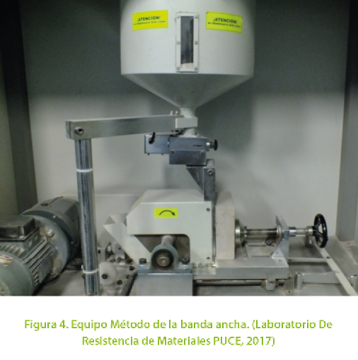 La fiabilidad del ensayo fue probada nuevamente en un posterior estudio que planteaba como propósito el establecimiento de un método universal que sea útil para bloques de hormigón y cerámica bajo criterios señalados por el CEN, Comité técnico de normalización Europeo (Petit, 2003). Además, en la misma investigación se advierte de la simplicidad y bajos costos del método. Bajo estas consideraciones, la norma ecuatoriana adoptó el método de ensayo de la banda ancha como mecanismo para determinar la resistencia al desgaste superficial.