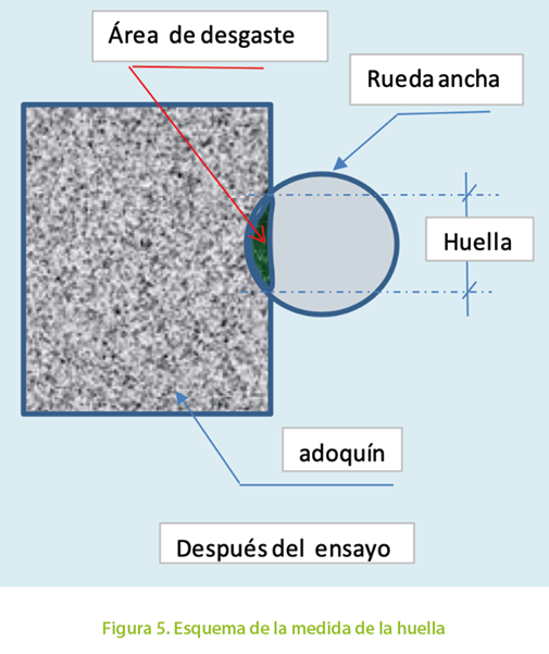 La medida del desgaste sobre la superficie expuesta a las cargas de solicitación del adoquín es determinada por la longitud de cuerda o huella que se genera al desgastar la superficie de contacto por la acción en conjunto del paso en flujo constante de arena normalizada (corindón) y una rueda de acero de material y dimensiones normalizada (diámetro de la rueda 200 mm, ancho de la rueda 70 mm), que gira a una velocidad constante de 75 revoluciones por minuto durante un minuto (European Standard EN 1338, 2006). La disposición del equipo y un esquema de la medida de la huella pueden ser vistas en la fig. N° 4 y N° 5 respectivamente.