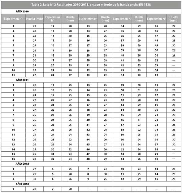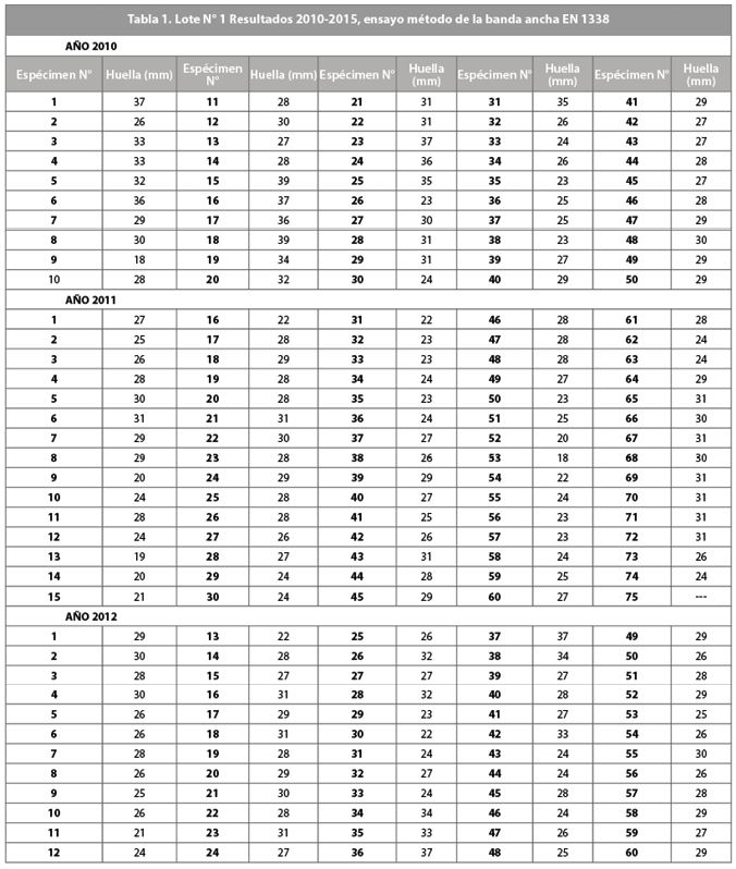 Se ha determinado que el valor característico de la huella o desgaste superficial en la gran mayoría de fábricas en el ecuador en ese periodo de investigación, previo a la publicación de la nueva norma ecuatoriana, es de 33,6 mm., para adoquines originarios de fábricas sin control de calidad, mientras que adoquines provenientes de fábricas que cuentan con control de calidad es de 32,3