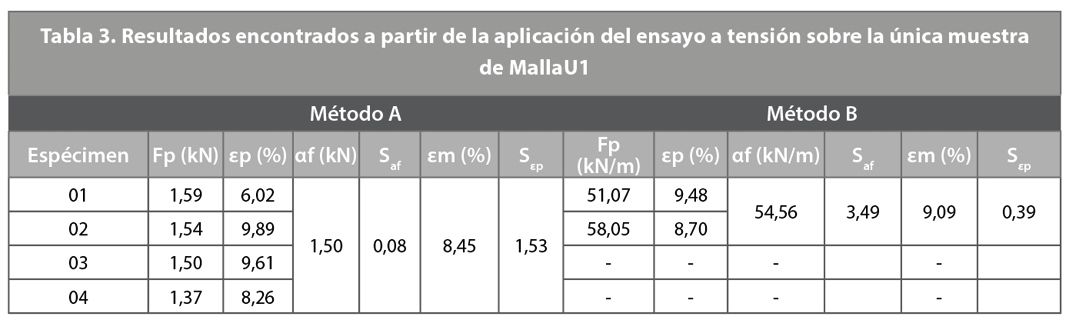 Los datos de resistencia última a la falla y deformación asociada a dicha falla, bajo el método B, que se resumen en la Tabla 3 y la Tabla 4, parcialmente1 permiten ser comparados con los datos reportados por los fabricantes, para el producto en específico asociado a dichos datos. De acuerdo con la Tabla 1, se tiene que la resistencia última a la tracción reportada por el fabricante, para la MallaU1 es igual a 70 kN/m, mientras que ese mismo dato, encontrado en la etapa de ensayos de este trabajo, corresponde a 54,56 kN/m. Esto supone una pérdida de resistencia en el material de aproximadamente 15,50 kN/m, con respecto al dato reportado por el fabricante.