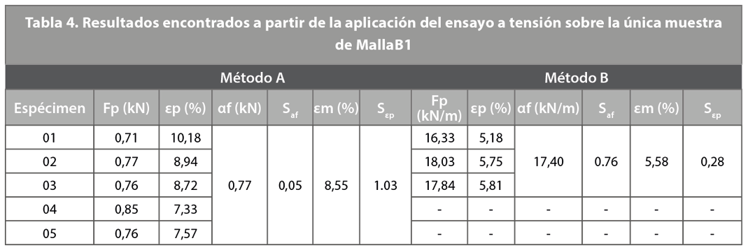 El mismo comportamiento se observa cuando se comparan los datos de resistencia última del material MallaB1; donde el fabricante reporta un valor igual a 20 kN/m y el encontrado en la etapa de ensayos de este documento arroja una magnitud de 17,40 kN/m, aquí la diferencia entre un valor y el otro es de aproximadamente 2,60 kN/m.
