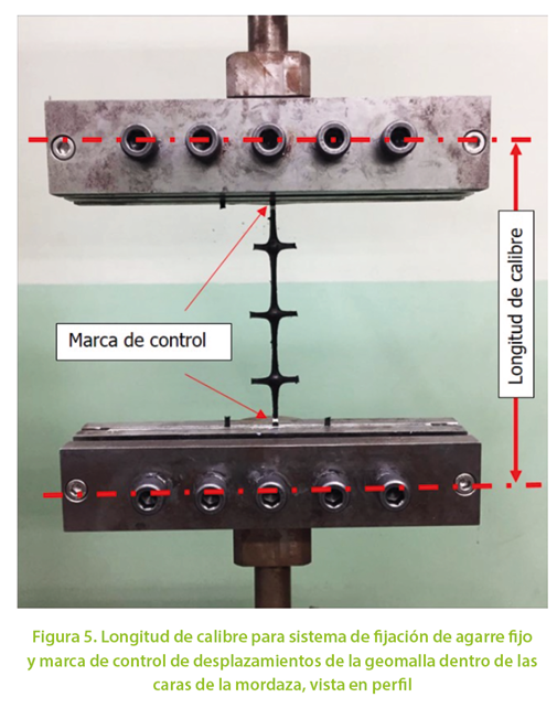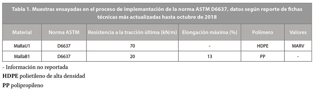 En la etapa de verificación de la correcta implementación del método de ensayo, se trabajó con 2 tipos de geomallas utilizadas como refuerzo a nivel nacional; que fueron ensayadas para determinar sus propiedades mecánicas a la tracción (resistencia y deformación últimas). Una vez obtenidas dichas características, se procedió a compararlas con los datos reportados en sus fichas técnicas. En dicha etapa se encontraron incongruencias entre los datos hallados a nivel de laboratorio y los reportados por el fabricante; lo cual dio indicios de posibles sobrevaloraciones en los datos reportados por los fabricantes y comercializadores de geomallas.