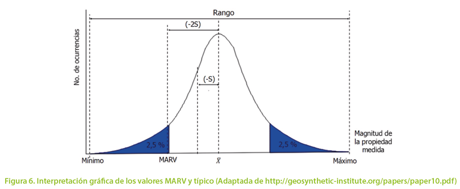 Por otra parte, el Instituto Geosintético (GSI, por sus siglas en inglés); menciona que mediante el valor promedio (o media) y la desviación estándar de una propiedad en particular (valores de resistencia en nuestro caso) se logra representar dicha propiedad estadísticamente en una curva de distribución normal, indistintamente de la variabilidad inherente de los datos; producto del proceso de fabricación de un geosintético en particular, el equipo y el procedimiento empleado en la obtención de los datos. En la Figura 6 se muestra gráficamente el concepto estadístico de valores MARV y típico, según la misma GSI.