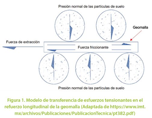 El ensayo ASTM D6637 modela la función de la geomalla para refuerzo dentro de la capa de suelo cuando es sometido a esfuerzos tensionantes longitudinales, provocados por la tracción entre las partículas de suelos en contacto con la superficie del refuerzo, tracción que a su vez puede ser incrementada por cargas dinámicas (sismo). Es decir, tanto fuerzas estáticas como dinámicas (produce una fuerza inercial) pueden actuar horizontalmente en conjunto sobre el refuerzo geosintético. La Figura 1 ilustra el mecanismo de transferencia de esfuerzos a tensión sobre el geosintético.