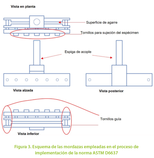 Las mordazas fueron diseñadas bajo las especificaciones técnicas establecidas en la norma D6637, por ende, cumplen con los requerimientos físicos y mecánicos mínimos que establece ASTM. Se puede observar en la Figura 3 las principales partes del mecanismo de estas.