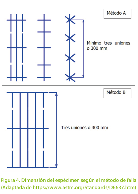 Para el método A –Método de tracción individual-, se debe preparar cada espécimen de ancho que contenga al menos una costilla que se cruce (o conjunto de costillas) a lo largo de la dirección de la prueba y que tenga al menos 3 uniones (dos aperturas) o 300 mm.