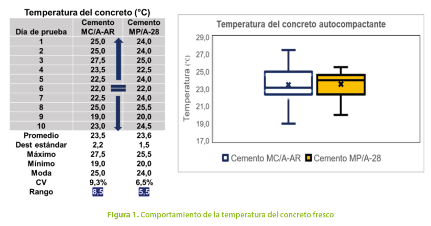 Se observó también que, durante los primeros cuatro días la temperatura del concreto fue superior usando cemento MC/A-AR, exceptuando el día 6 donde ambas mezclas alcanzaron la misma temperatura. En los días restantes el comportamiento fue inverso. De lo anterior se puede deducir que los datos presentan un comportamiento estocástico.