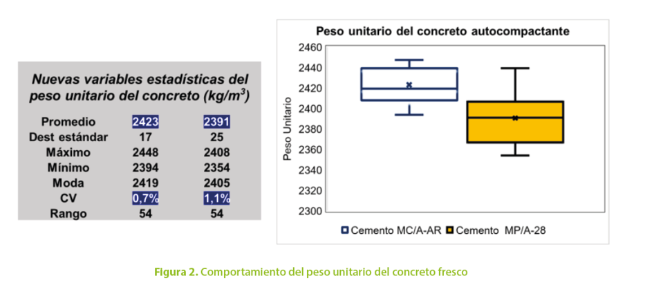 Es interesante apreciar que ambas mezclas tienen el mismo rango, sin embargo, la mezcla con cemento MC/A-AR presenta una menor dispersión y al graficar estos datos en la figura 4.7 se observa que se obtiene un concreto 1,3% más denso al utilizar el cemento MC/A-AR.