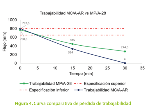 En general ambas mezclas de concreto cumplen con el flujo inicial, pero se distingue que el concreto con cemento MP/A-28 mantiene el flujo sin restricción por un tiempo mayor.