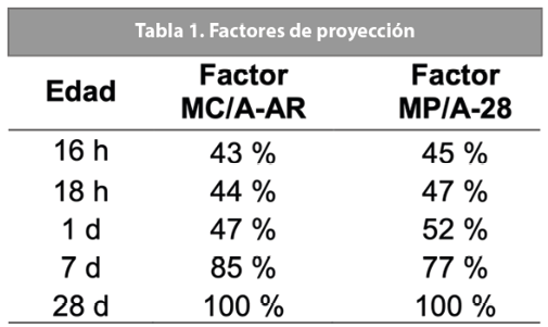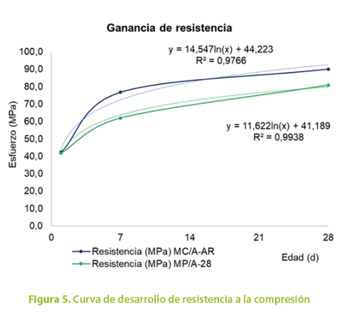 Se observa que la mezcla con cemento MC/A-AR tiene un mayor desarrollo de (nominal especificada de 68,6 MPa) la cual alcanza a los 6 días, mientras que la mezcla que contiene cemento MP/A-28,esta resistencia se logra a la edad de 11 días.