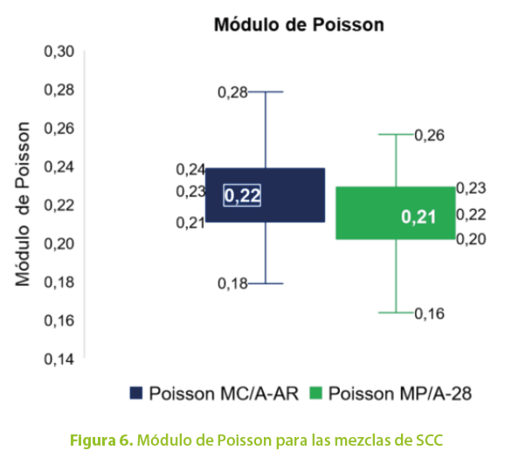 En la figura 6 se observa que el módulo de Poisson promedio es de 0,22 para el concreto con cemento MC/A-AR y 0,21 para el concreto con cemento MP/A-28.