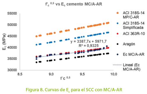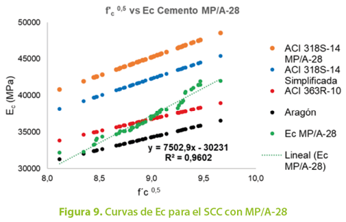 Al no existir mayor diferencia en la magnitud de los resultados de Ec en ambas mezclas de SCC, en la figura 10 se presenta la curva experimental para la totalidad de los datos, de la cual se obtiene la ecuación . Sin embargo, debido a que la mayoría de los diseñadores utilizan la ecuación simplificada del ACI 318S-14, los autores proponen una ecuación acorde con el desempeño del SCC con cementos MC/A-AR y MP/A-28, la cual posee un formato simplificado al igual que la del ACI 318S-14.