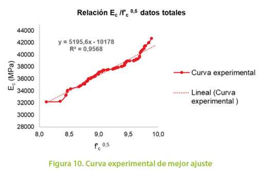 La figura 8 muestra la relación lineal que existe entre Ec y . En esta se advierte, como la curva experimental tiene gran similitud con la curva ACI 363R-10, tanto en pendiente como en magnitud, siendo la diferencia promedio entre ambas de 0,96 %.
