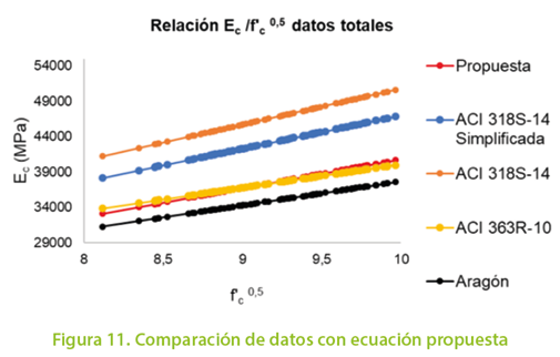 La figura 9 muestra que la curva experimental tiene una pendiente diferente a todas las mostradas empezando con el dato mínimo cercano a la curva de Aragón, intersecando la curva generada con la ecuación del ACI 363R-10 y finalizando con el dato máximo cercano a la curva generada con la ecuación simplificada del ACI 318S-14. Esto se justifica con la dispersión en el Ec mostrado en la figura 8.