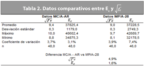 Al hacer una comparación de la diferencia en magnitud de Ec entre la mezcla SCC con cemento MC/A-AR y la que SCC con cemento MP/A-28 (Tabla 2), se observa que no hay mayor afectación en la magnitud del Ec cuando usa cemento MC/A-AR o cemento MP/A-28.