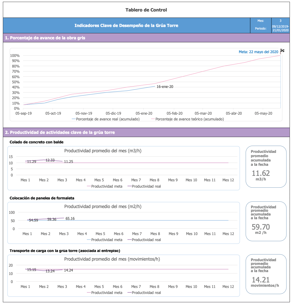 c) Productividades específicas de la ruta crítica de la obra gris: Se dio seguimiento a las tres productividades que se consideraron las más importantes para el avance de la obra gris: 1) Colado de concreto mediante balde, en metros cúbicos por hora (m3/h); 2) Colocación de formaleta, en metros cuadrados por hora (m2/h), y 3) Transporte de piezas de material o equipo asociadas a la construcción de entrepisos, en movimientos por hora (movimientos/h). El tablero de control dio un promedio mensual y un promedio acumulado para cada una de estas productividades. Además, en el tablero de control, se puede visualizar las metas mínimas de rendimiento, las cuales las establece el equipo del proyecto de construcción.