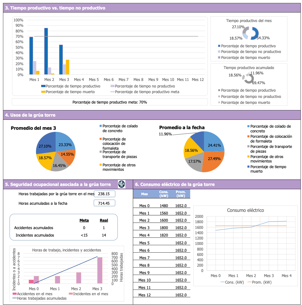 El tablero muestra además una disminución de la productividad del colado de concreto del mes 2 al mes 3 que podría deberse en parte a una gran cantidad de incidentes ocurridos en el mes 3. Las cantidades mensuales de incidentes son visibles en la Figura 8. La instalación de otra grúa torre pudo haber afectado a la productividad del colado de concreto en el mes 3. El motor de elevación de la grúa torre analizada sufrió una falla mecánica en el mes 3. Esta falla mecánica ocurrió cuando se realizaba la actividad de colado de concreto. La falla mecánica pudo afectar a la productividad del colado de concreto en el mes 3.
