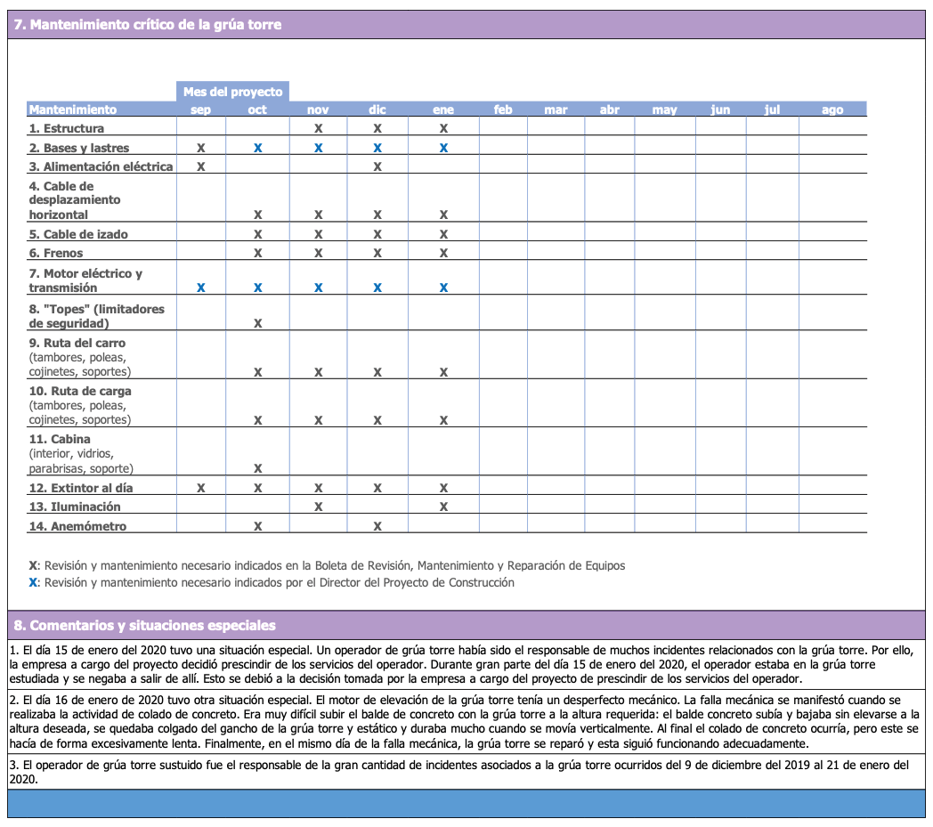 g) Mantenimiento mensual de la grúa torre: Se creó una lista de chequeo, en el tablero de control, de aquellos mantenimientos mensuales más importantes y sus frecuencias recomendadas. El tablero de control presenta tanto los mantenimientos programados como los que sucedieron en la realidad.