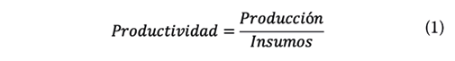 Prokopenko (1987/1989) afirma que la productividad puede definirse como la relación entre la producción obtenida por un sistema de producción o servicios y los recursos empleados para obtenerla. Según García (como se citó en Acosta, 2016), la productividad es la relación aritmética entre la cantidad producida y la cuantía de los recursos empleados en la producción. Prokopenko (1987/1989) y Acosta-Sandoval (2016) indican la ecuación (1) para la productividad: