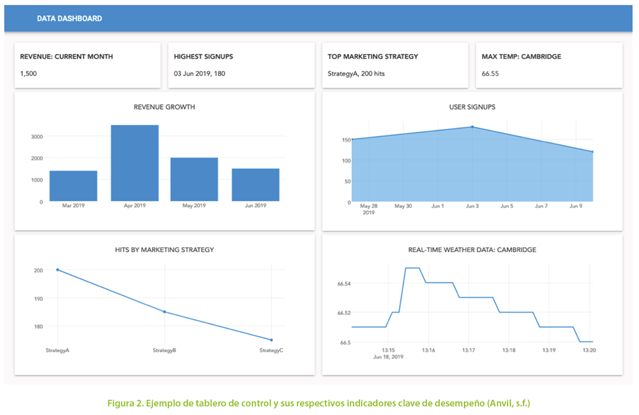 Garrote-Bortolussi (2005) indica que el tablero de control consiste en una organización sistemática de la información, la cual se destina a facilitar el diagnóstico de una situación y permitir su monitoreo permanente. Así también, la autora señala que el tablero de control contiene únicamente la información más relevante del área que se desea controlar. Esta autora indica que esa información se presenta de manera organizada mediante un conjunto de indicadores clave de desempeño o KPI (key performance indicators) y que el seguimiento periódico de este conjunto permite conocer la situación a monitorear. La Organización de las Naciones Unidas (2010) menciona que un indicador clave de desempeño es una característica específica, medible y observable. Cabe resaltar que los tableros de control presentan su información de forma gráfica. En la Figura 2, se puede visualizar un ejemplo de tablero de control y sus respectivos indicadores clave de desempeño.